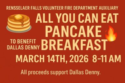 The Rensselaer Falls Volunteer Fire Department Auxiliary is serving up an ALL‑YOU‑CAN‑EAT breakfast you won’t want to miss to benefit Dallas Denny!
