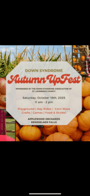 Saturday 10/18/25, 11-2, Applewood Orchards, 176 Johnson Rd, Rensselaer Falls, NY. Fun, food and games. Free admission to orchards for families with an individual with DS. Sponsored by the DSA of SLC