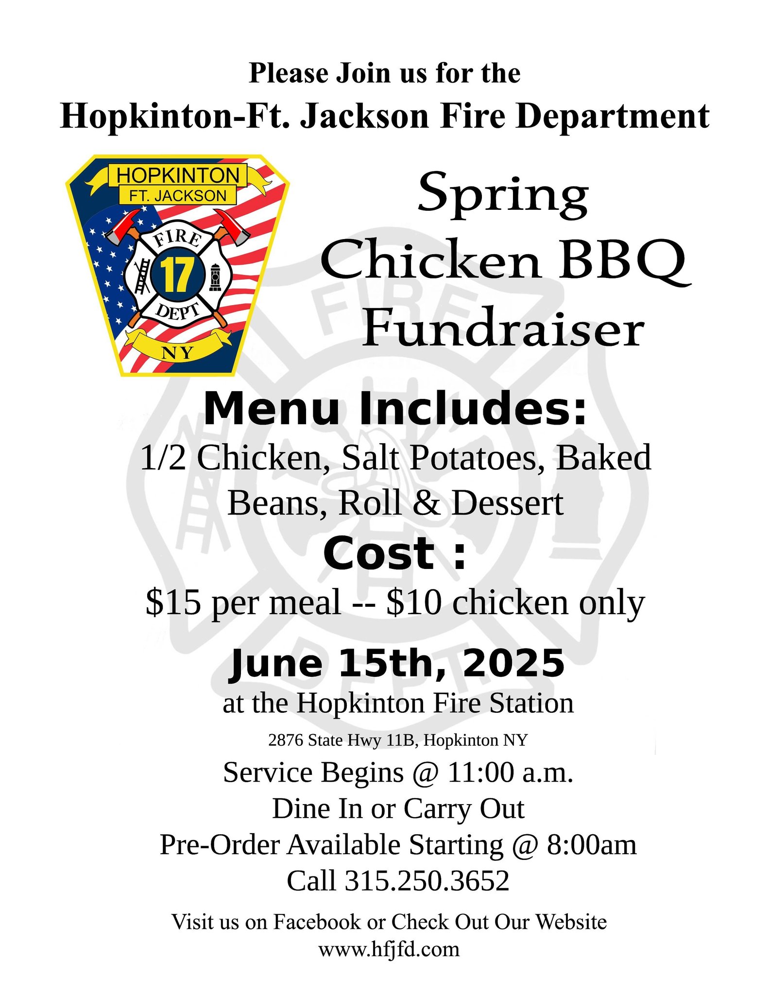 Please Join us for the Hopkinton-FT. Jackson Fire Department Spring Chicken BBQ Sunday June 15 11am til gone at the station on Route 11B in Hopkinton! 1/2 Chicken, Salt Potatoes, ...