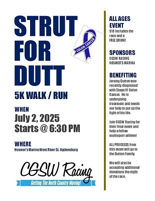 Strut for Dutt is Wednesday July 2nd at Hosmer's Marina in Ogdensburg at 6:30pm. It's a 5k run, walk, crawl, move, whatever - to help a fellow multisport athlete, Jeremy ...