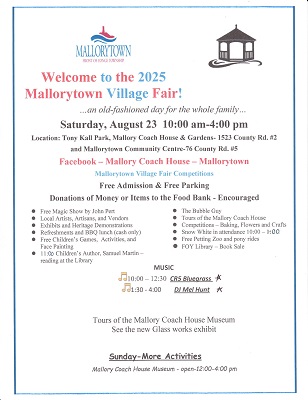 Enjoy a step back in time at the 14th annual MALLORYTOWN VILLAGE FAIR Saturday, August 23, 2025, 10:00 am – 4:00 pm at the Mallory Coach House and the Community ...