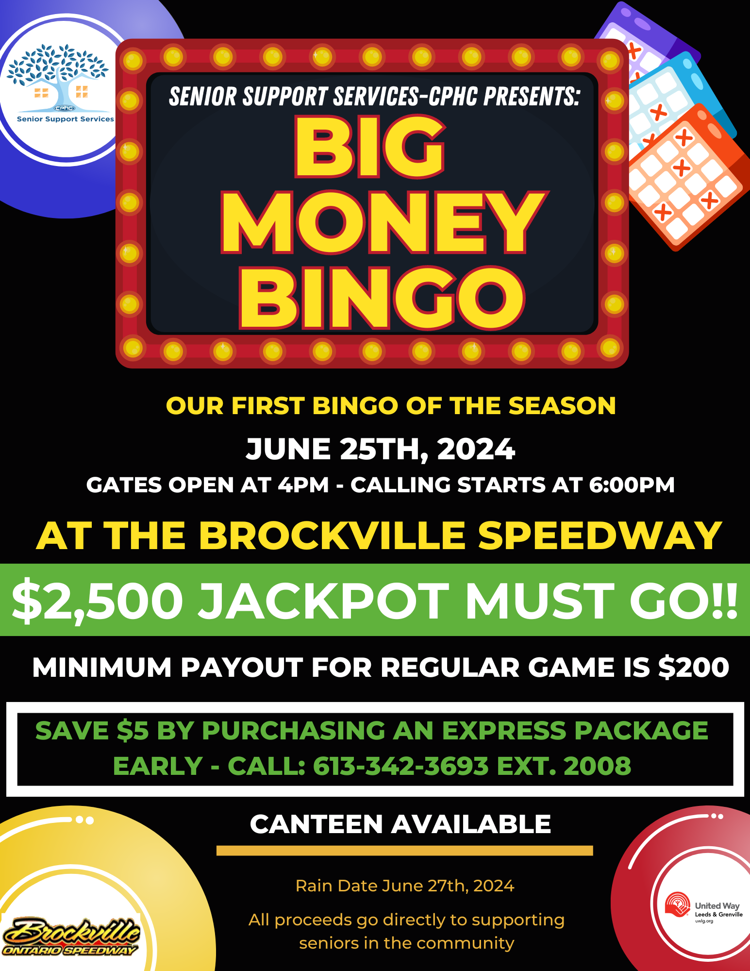CPHC Big Money Bingo is Tuesday July 23 at the Brockville Speedway! Gates open at 4, calling at 6 - they'll have a canteen. Stay in your car and play bingo! Someone will win $2500! Benefits senior programs at CPHC in Brockville! 613-242-3693 x2008